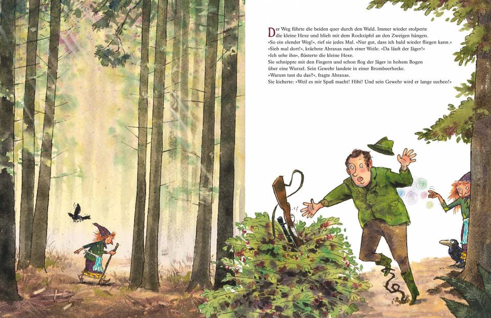 In einem kleinen Häuschen, tief im Wald, da wohnt die kleine Hexe mit ihrem Raben Abraxas. Jeden Tag übt sie fleißig für die große Hexenprüfung. Aber das Hexen ist nun mal keine einfache Sache. An diesem Morgen ist alles besonders verflixt: Erst regnet es Buttermilch und dann zaubert die kleine Hexe auch noch ihren Besen entzwei! Um einen neuen zu kaufen, macht sich die kleine Hexe auf den Weg in die Stadt – und sorgt dort für jede Menge Trubel …